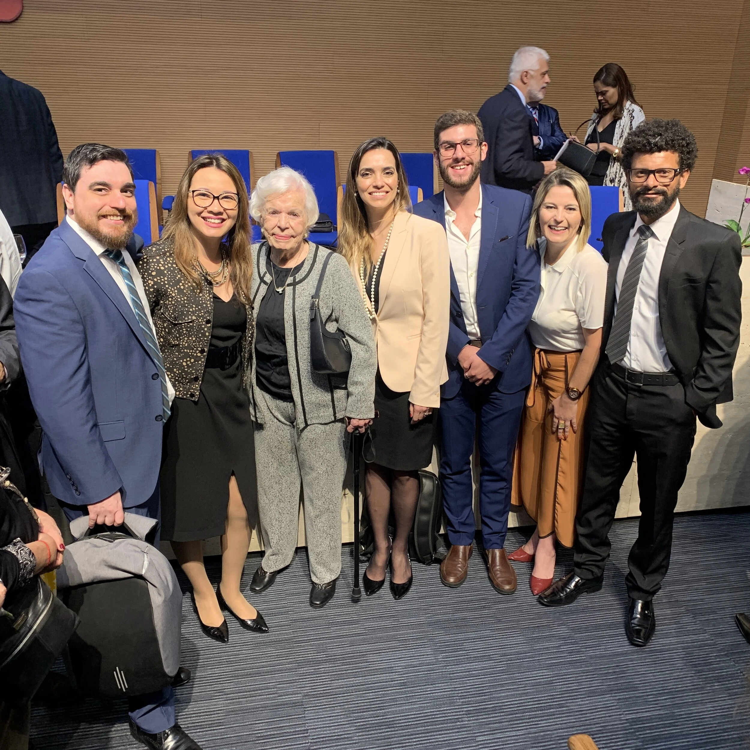 Durante a solenidade, Gabriela Araujo, coordenadora do Núcleo da Memória dos Direitos Humanos, fez uma homenagem à vice-presidente da Comissão de Direitos Humanos, Ana Amélia Mascarenhas Camargos, ao lado de outros membros do Grupo Prerrogativas, um coletivo que reúne advogados, juristas e acadêmicos de todo o país e vem ganhando notoriedade por sua defesa atuante do Estado Democrático de Direito e das garantias fundamentais.