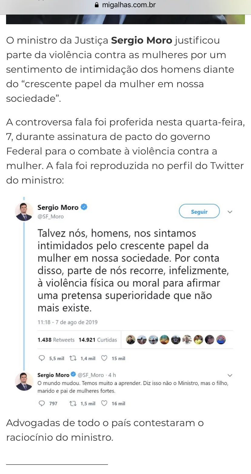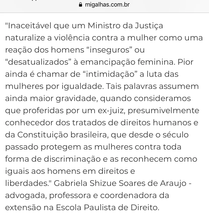O Portal Migalhas ouviu a opinião de algumas advogadas (veja a matéria completa aqui) sobre a controversa declaração do Ministro Sérgio Moro, em que este tentou justificar parte da violência contra as mulheres por um sentimento de intimidação dos homens, diante do crescimento do papel das mulheres na sociedade.